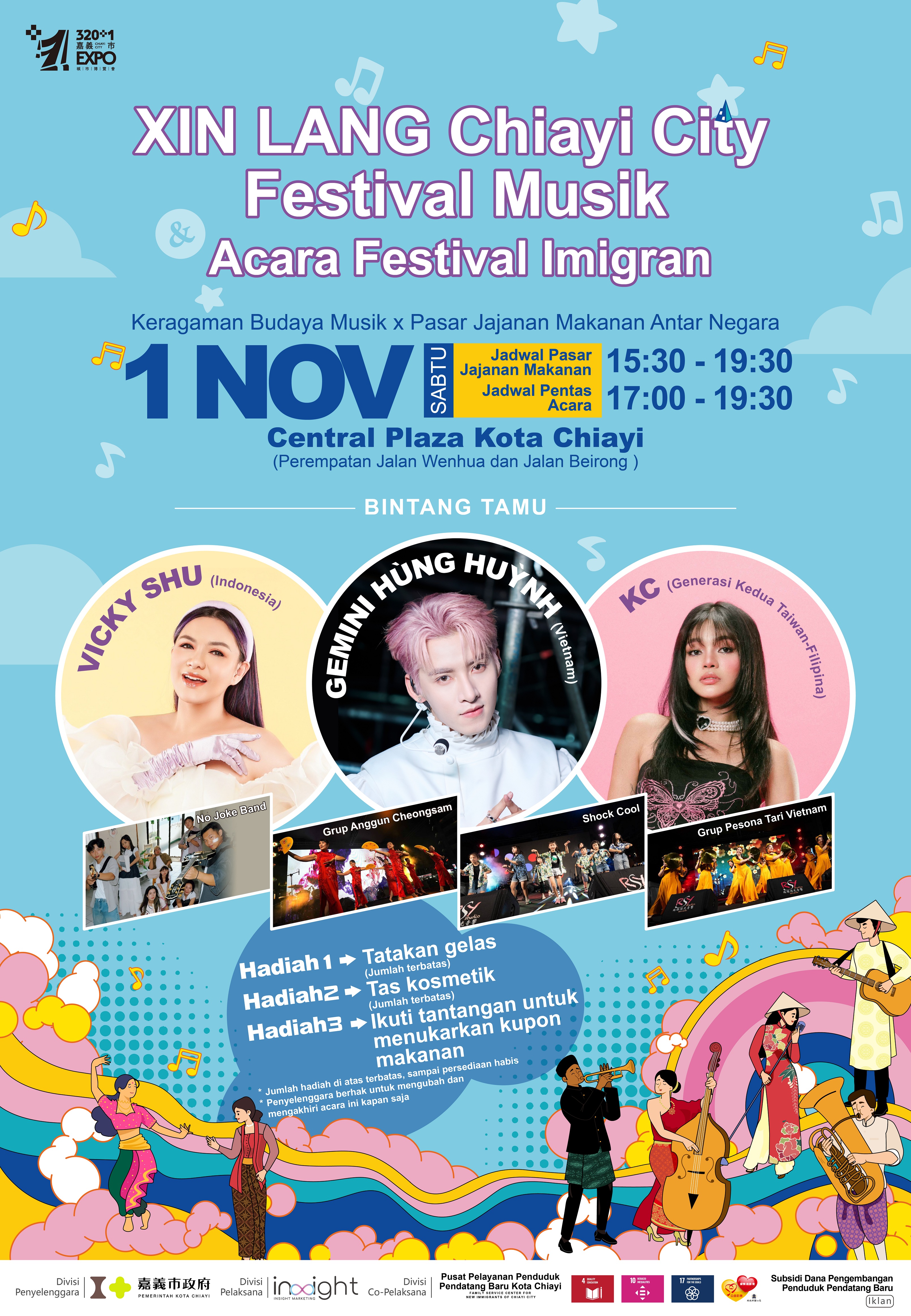 114年11月1日(星期六)15時30分至19時30分假嘉義市中央廣場(嘉義市文化路與北榮街口)辦理,活動邀請來自越南、印尼的異國歌手、新住民及新二代表演團體,以音樂舞蹈的交流形式進行異國音樂文化演出,並設置異國美食文創市集攤位。歡迎新住民參加~詳細內容請參考活動海報~